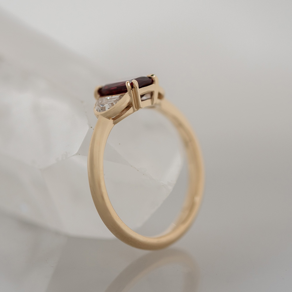 An emerald-cut ruby set in double claw prongs is flanked by two bezel-set half-moon diamonds, sitting in a pierced basket on a half-rounded 14K yellow gold band.