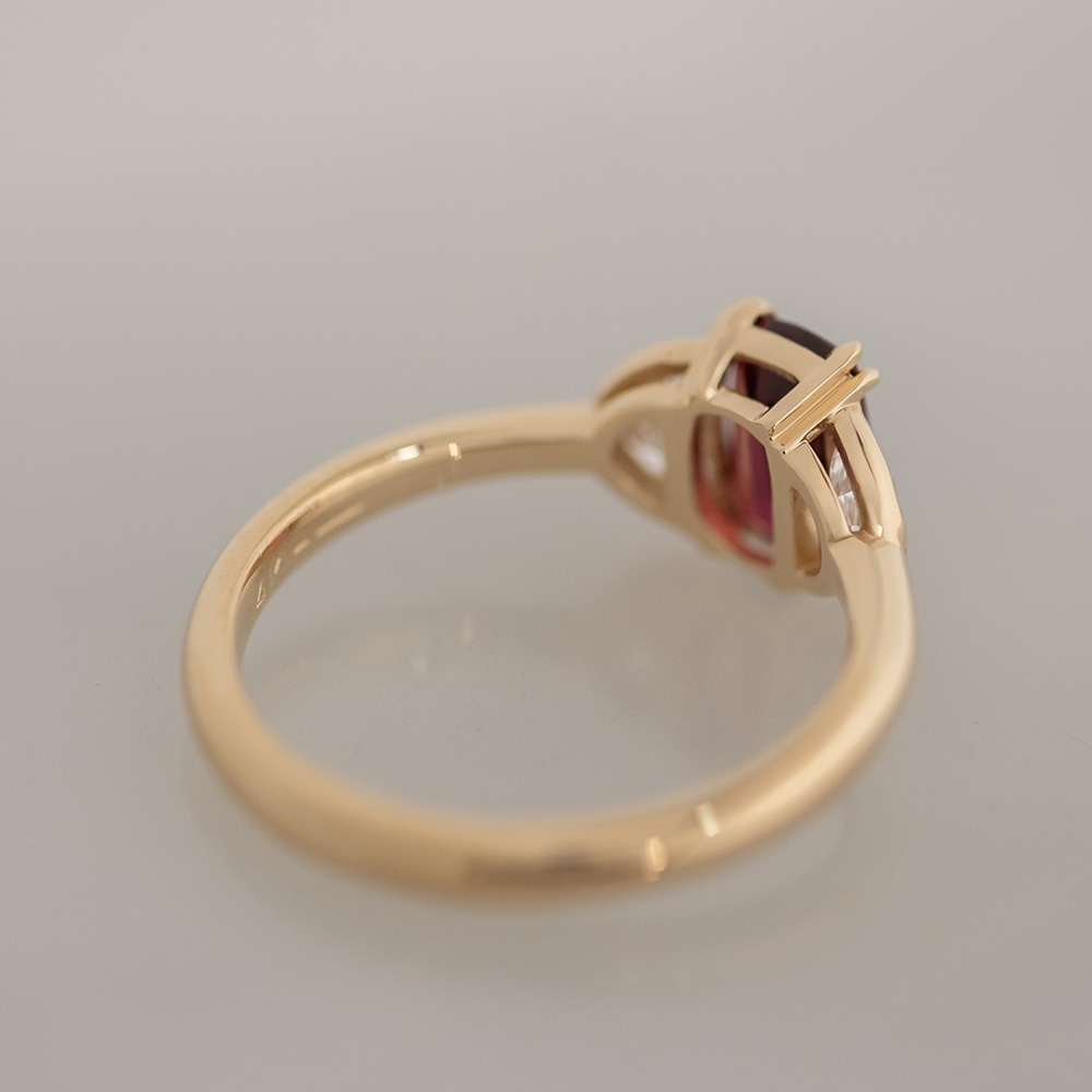 An emerald-cut ruby set in double claw prongs is flanked by two bezel-set half-moon diamonds,sitting in a pierced basket, on a half-rounded 14K yellow gold band.